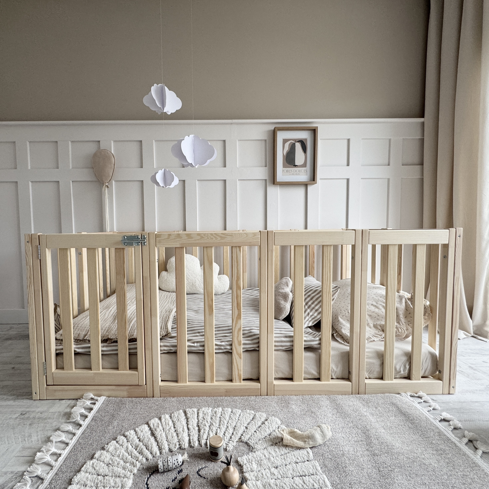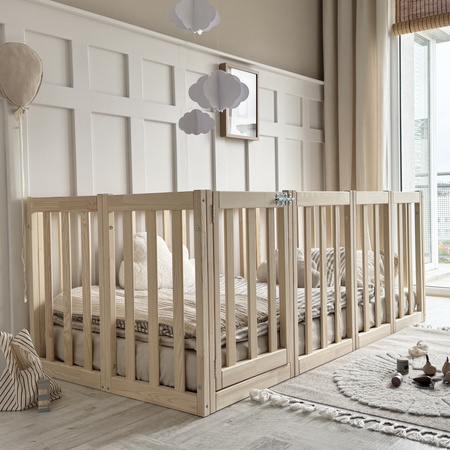 Livré complet : cadre, sommier composé de lattes en bois massif, barrières, vis et colle à l’eau (pour coller les éléments reliés par chevilles en bois). Éléments poncés main & mécaniquement - arêtes arrondies pour plus de sécurité.